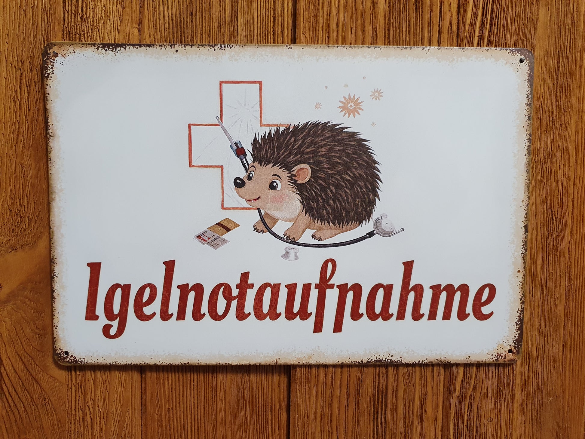 Das 30x20cm grosse Metallschild wurde im Vintage-Stil gefertigt und ist perfekt für alle Igel-Pflegestellen bzw. Notaufnahmen.