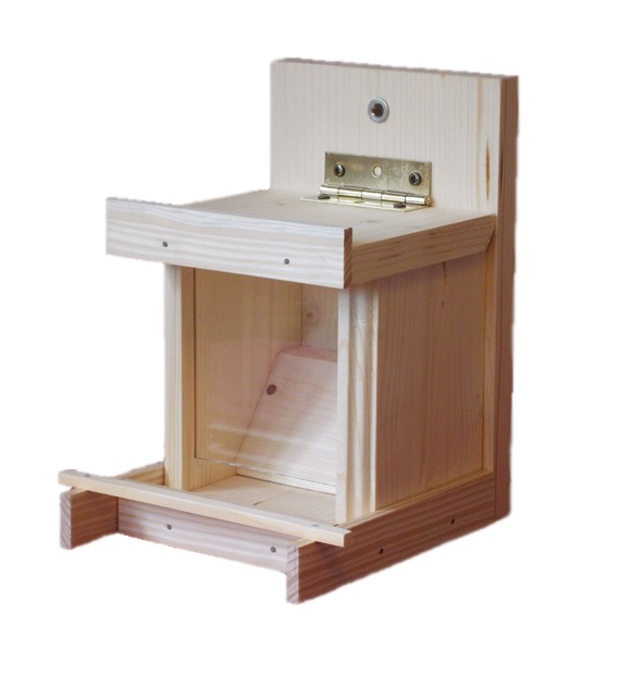 Um die Futterstelle zu reinigen kann die Plexiglasscheibe ganz einfach nach oben rausgeschoben werden.